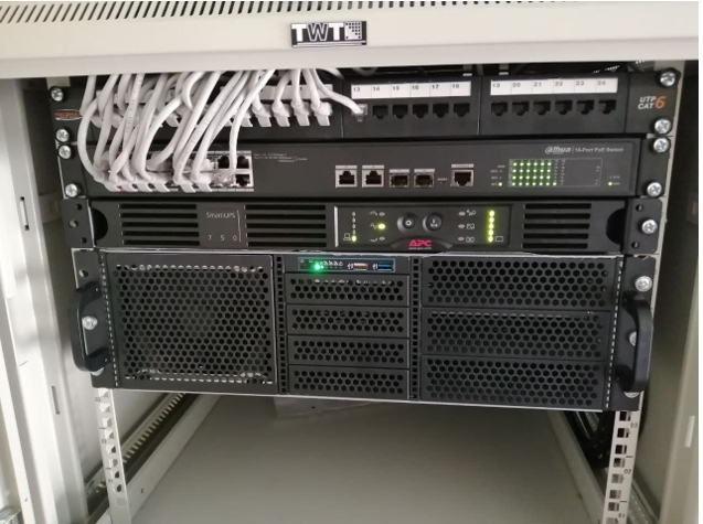 Оборудование для управления комплексом видеонаблюдения и охранной сигнализации, коммутатор с подведёнными кабелями, видеосервер были монтированы в надёжно замыкаемый телекоммуникационный шкаф.
